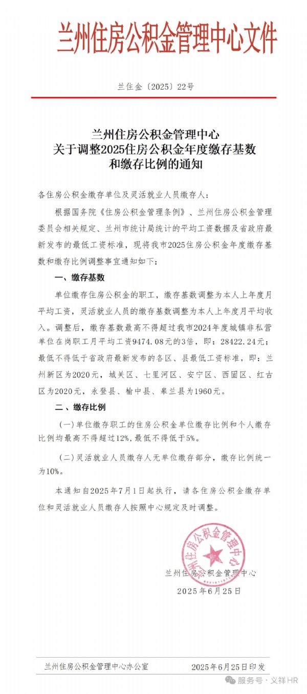 蘭州住房公積金管理中心關(guān)于調(diào)整2025住房公積金年度繳存基數(shù)和繳存比例的通知